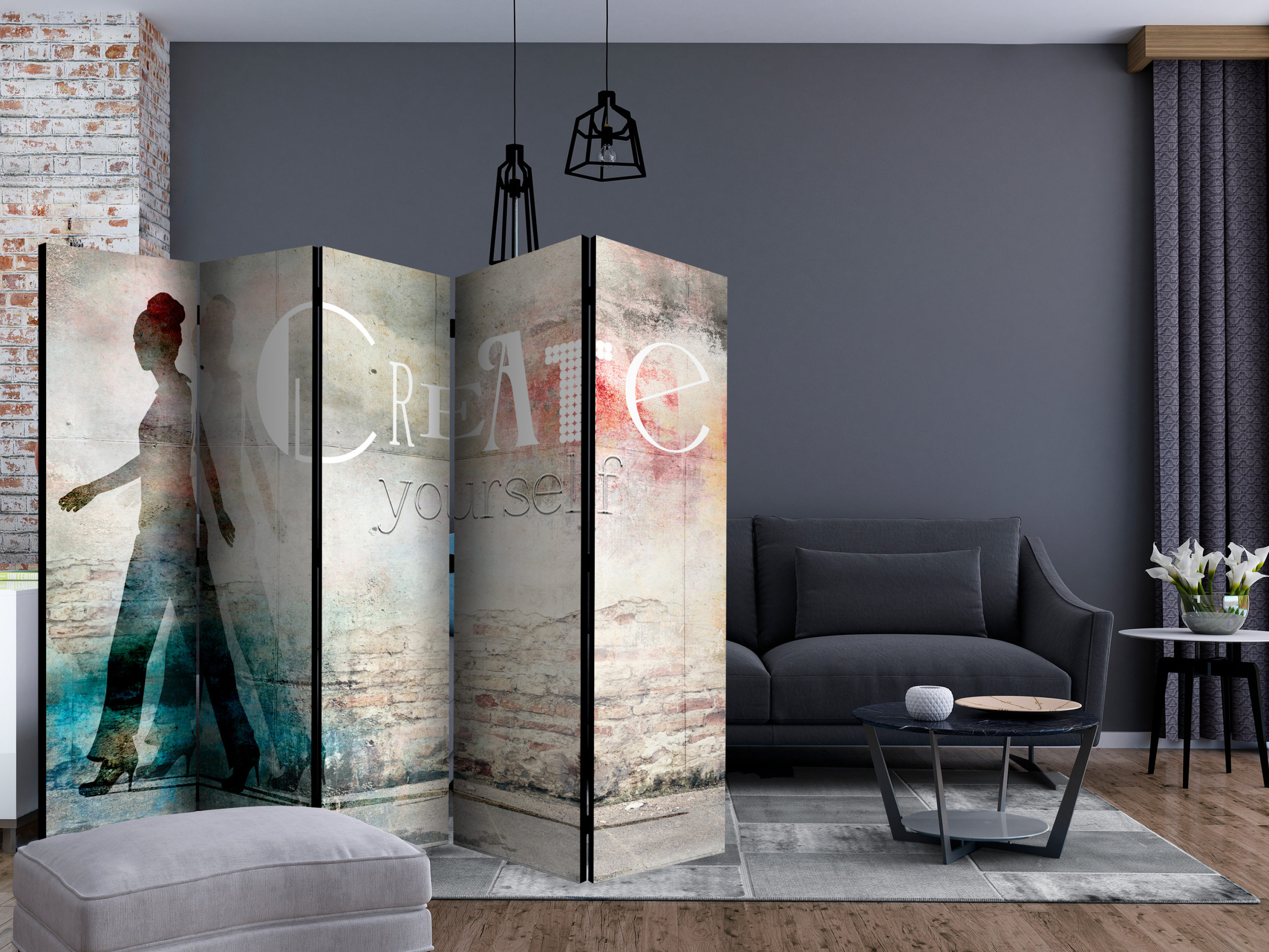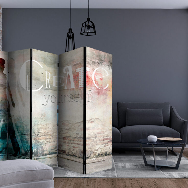 Het decoratieve vouwscherm “Create yourself II [Room Dividers]” past uitzonderlijk mooi in een modern interieur. Het houten tweezijdig bedrukte vouwscherm geeft niet alleen een mooie opdeling van een ruimte maar geeft ook een fantastische flair aan uw interieur. De perfectie uitvoering en het originele motief in full HD uitvoering zorgen ervoor dat de kamervouwschermen iedere ruimte een originele charme verschaffen. Een prachtig kamervouwscherm is een zeer originele versiering en kan bijvoorbeeld prima worden toegepast in woningen of dienstruimten. (kapsalon, dokterskliniek, administratiekantoor etc)