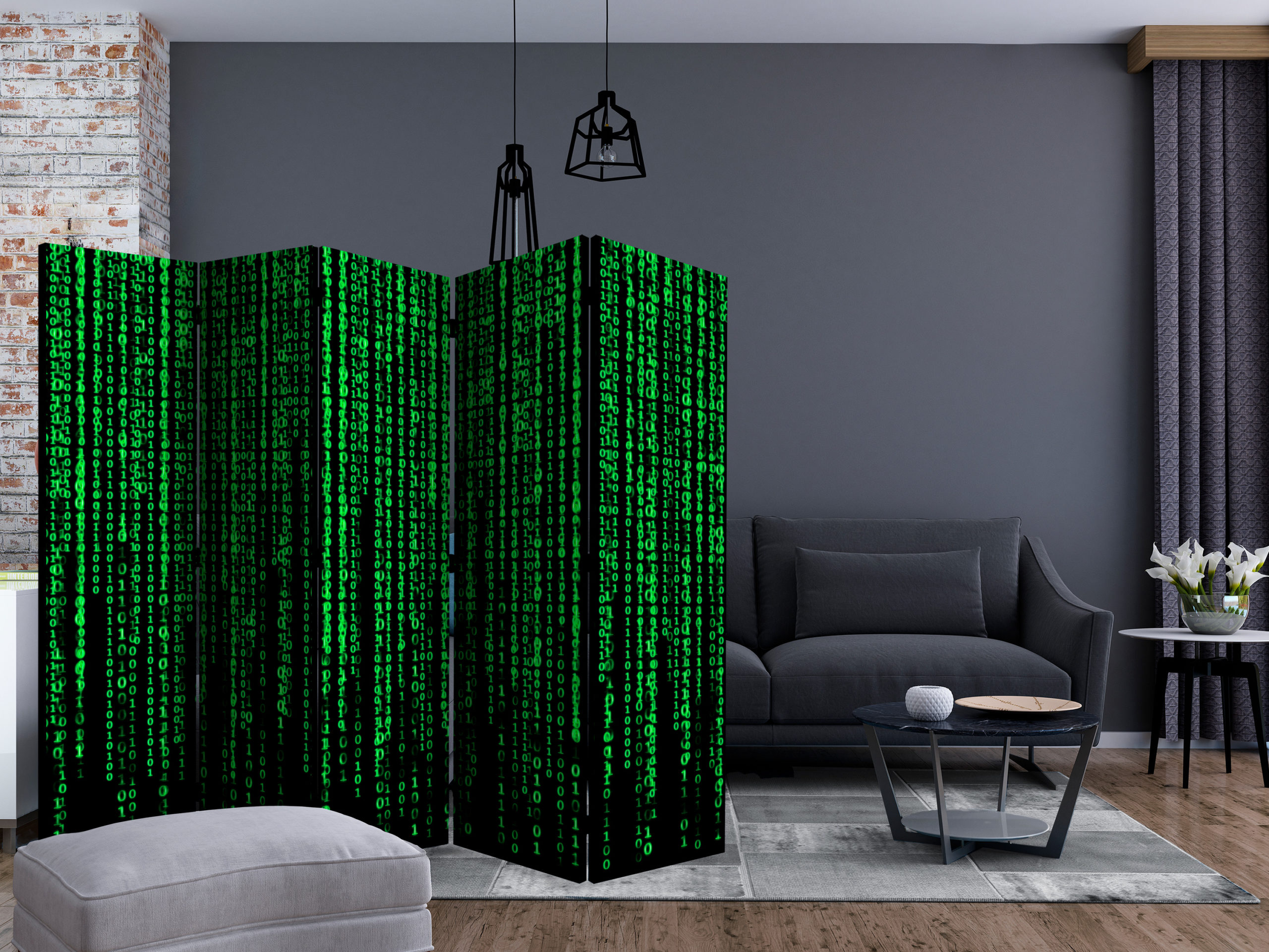 Het decoratieve vouwscherm “Digital Rain II [Room Dividers]” past uitzonderlijk mooi in een modern interieur. Het houten tweezijdig bedrukte vouwscherm geeft niet alleen een mooie opdeling van een ruimte maar geeft ook een fantastische flair aan uw interieur. De perfectie uitvoering en het originele motief in full HD uitvoering zorgen ervoor dat de kamervouwschermen iedere ruimte een originele charme verschaffen. Een prachtig kamervouwscherm is een zeer originele versiering en kan bijvoorbeeld prima worden toegepast in woningen of dienstruimten. (kapsalon, dokterskliniek, administratiekantoor etc)