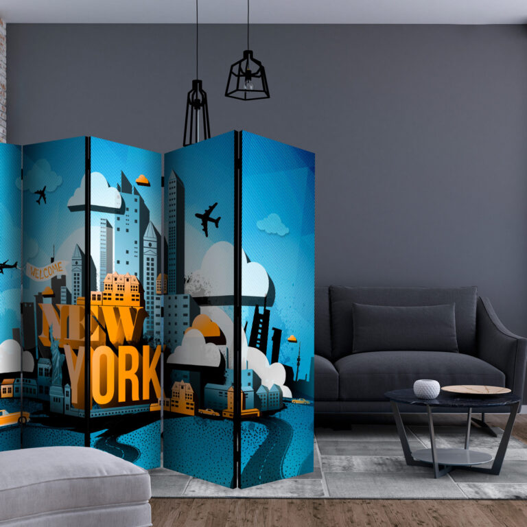 Het decoratieve vouwscherm “New York – welcome II [Room Dividers]” past uitzonderlijk mooi in een modern interieur. Het houten tweezijdig bedrukte vouwscherm geeft niet alleen een mooie opdeling van een ruimte maar geeft ook een fantastische flair aan uw interieur. De perfectie uitvoering en het originele motief in full HD uitvoering zorgen ervoor dat de kamervouwschermen iedere ruimte een originele charme verschaffen. Een prachtig kamervouwscherm is een zeer originele versiering en kan bijvoorbeeld prima worden toegepast in woningen of dienstruimten. (kapsalon, dokterskliniek, administratiekantoor etc)