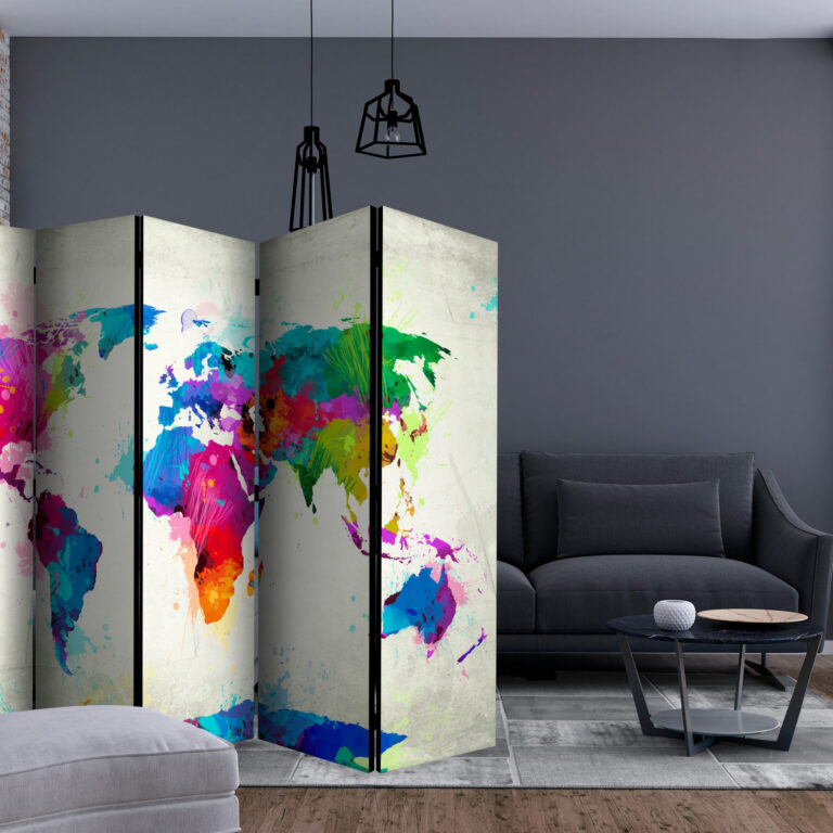 Het decoratieve vouwscherm “The map of happiness II [Room Dividers]” past uitzonderlijk mooi in een modern interieur. Het houten tweezijdig bedrukte vouwscherm geeft niet alleen een mooie opdeling van een ruimte maar geeft ook een fantastische flair aan uw interieur. De perfectie uitvoering en het originele motief in full HD uitvoering zorgen ervoor dat de kamervouwschermen iedere ruimte een originele charme verschaffen. Een prachtig kamervouwscherm is een zeer originele versiering en kan bijvoorbeeld prima worden toegepast in woningen of dienstruimten. (kapsalon, dokterskliniek, administratiekantoor etc)